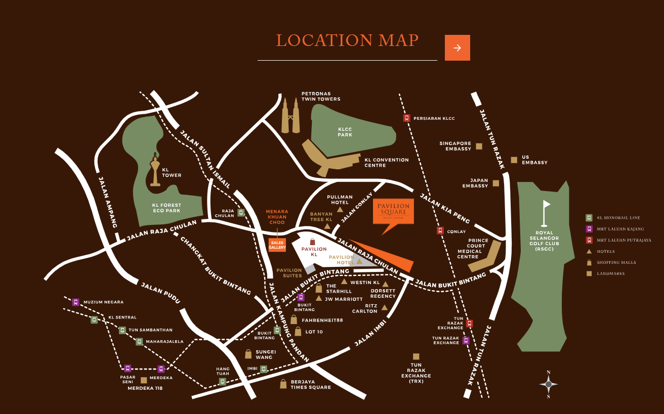Nestled in the heart of Kuala Lumpur, Pavilion Square provides convenient access to nearby landmarks and a variety of amenities including recreation, transportation, medical, and education services.